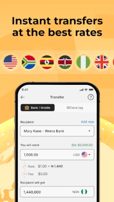 Barka da zuwa Cleva, ingantacciyar hanya don gudanar da harkokin kuɗinka na duniya da farin ciki! Cleva na baka damar tura kuɗi cikin sauri da sauƙi ga masoyanka a Najeriya, Ghana, Uganda, da sauran ƙasashe masu yawa a Afirka. Tsarin rajista mai santsi ne, kuma cikin kankanin lokaci za ka iya fara aiwatar da mu'amalarka. Tare da Cleva, za ka more musayar kuɗi a farashi mai gata, ba tare da wani ɓoyayyen caji ko na wata-wata ba. Mun tsara Cleva don ta ba ka damar tura kuɗi cikin aminci, sauri, kuma abin dogaro, ta yadda za ka sami kwanciyar hankali a kowane lokaci.