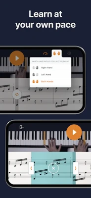 Don inganta ilmantarka, flowkey tana dauke da fasalulluka na musamman. Misali, zaka iya amfani da yanayin 'Loop' don maimaita wani sashe mai wuya har sai ka kware. 'Select a Hand' yana ba ka damar gwada kowane hannu daban, yana sa horo ya zama mai inganci. Kuma da 'Wait Mode,' flowkey tana jiran ka buga madaidaitan bayanan kafin ta ci gaba, tana ba ka amsa nan take ta hanyar makarufo ko haɗin Bluetooth/MIDI. Haka kuma, zaka iya kallon kwararru suna kida, inda za a nuna maka bayanan da ke gaba da yadda zaka sanya yatsunka. Ko kuma kawai ka kunna 'Just Play' kuma flowkey za ta ci gaba da bin kidan naka, har ma da 'Full Sheet Music View' ga masu amfani da allunan don karanta rubutun kida na gargajiya. flowkey tana aiki tare da kowane irin piano, daga na gargajiya zuwa na zamani.