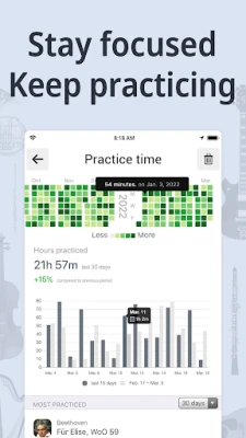 Wannan manhaja tana ba da cikakken goyon baya ga kusan kowace kayan kiɗa, tun daga piano, guitar, ukulele, mandolin, violin, cello, viola, bass, drums, flute, da harmonica, har zuwa kayan kiɗa masu canza sauti kamar B-flat clarinet, F horn, E-flat saxophone, da D-flat piccolo. Tana ƙunshe da yanayin daidaita sauti iri biyu: chromatic tuner don auna pitch da ƙarfin sauti, da kuma yanayin pitch fork. Haka kuma, zaka iya saita A4 frequency naka (default 440Hz), rikodin wasanka da integrated one-touch recorder, har ma ka loda kayan kiɗan ka na kanka don yin atisaye tare da su. Akwai kuma yanayin metronome na hasken walƙiya, mai amfani a wurare masu amo, inda zaka iya ji da gani bugun metronome ta hanyar walƙiya, har ma ka jefa hasken a bango don dukan bango ya yi walƙiya tare da bugun. Wannan kayan aiki na kwararru yana ba da iko mai kyau kan BPM, mai gano BPM, da kuma mai bin diddigin lokacin atisaye.