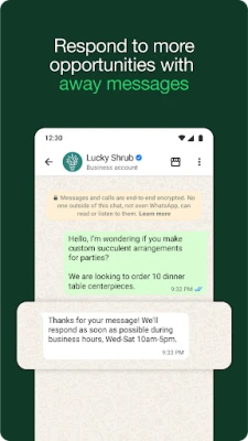 Faɗaɗa kasuwancinku da haɓaka tallace-tallace ya zama mai sauƙi da WhatsApp Business. Yana taimaka muku wajen isa ga sabbin abokan ciniki, yin talla, da kuma ƙirƙirar alaƙa mai zurfi. Kasuwanci za su iya haɓaka tallace-tallace ta hanyar aikawa da tayi na musamman ga abokan ciniki, ƙirƙirar tallace-tallace waɗanda ke kai tsaye zuwa WhatsApp, da kuma nuna kundin kayayyaki (catalog). Wannan yana ba abokan ciniki damar yin oda da biyan kuɗi** cikin sauƙi a cikin manhajar. Idan kuna da lambar waya daban, za ku iya gudanar da asusun kasuwanci da na sirri a kan na'ura ɗaya, kuma za a iya sauya tarihin taɗi cikin sauƙi. Haka kuma, za a iya haɗa na'urori guda biyar ko fiye da haka (har zuwa 10 idan an shiga Meta Verified***) don gudanar da ayyukanku yadda ya kamata. Waɗannan kayan aikin suna taimakawa wajen bunƙasa kasuwanci da samar da ingantattun hanyoyin hulɗa.